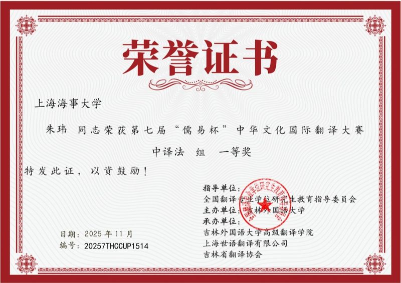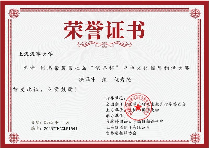 此次法语专业学生获该届赛事全国唯一的一等奖,体现了法语专业自成立以来深耕教学的成果。2025年2月,23级陈昫儒同学获第五届“海洋杯”国际翻译大赛中译法组二等奖,朱玮同学获法译中组、中译法组三等奖,琚玮琪同学获法译中组优秀奖;2025年9月,琚玮琪同学作为全国102名选手之一代表上海海事大学参加“外教社杯”第十七届全国高校法语演讲比赛。法语专业将继续坚守育人初心、深化教学改革,坚持“以赛促教、以赛促学”,不断取得新的佳绩。