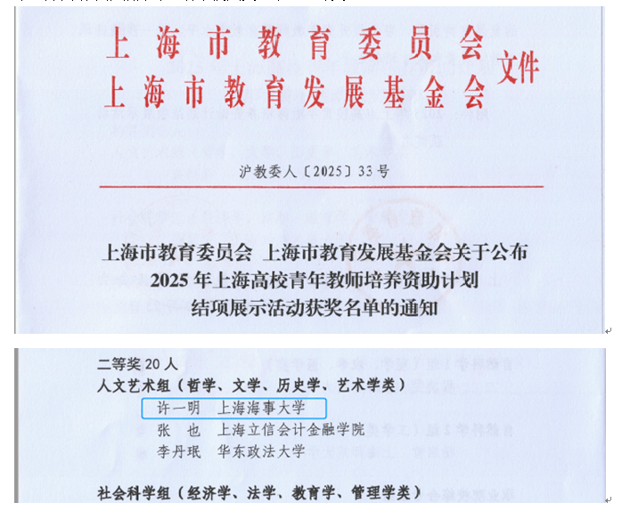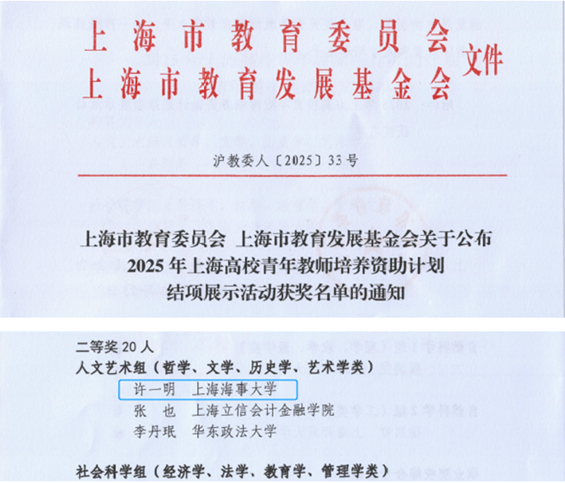 近日,2025年上海高校青年教师培养资助计划公布结项结果,外国语学院教师许一明荣获人文艺术组二等奖。